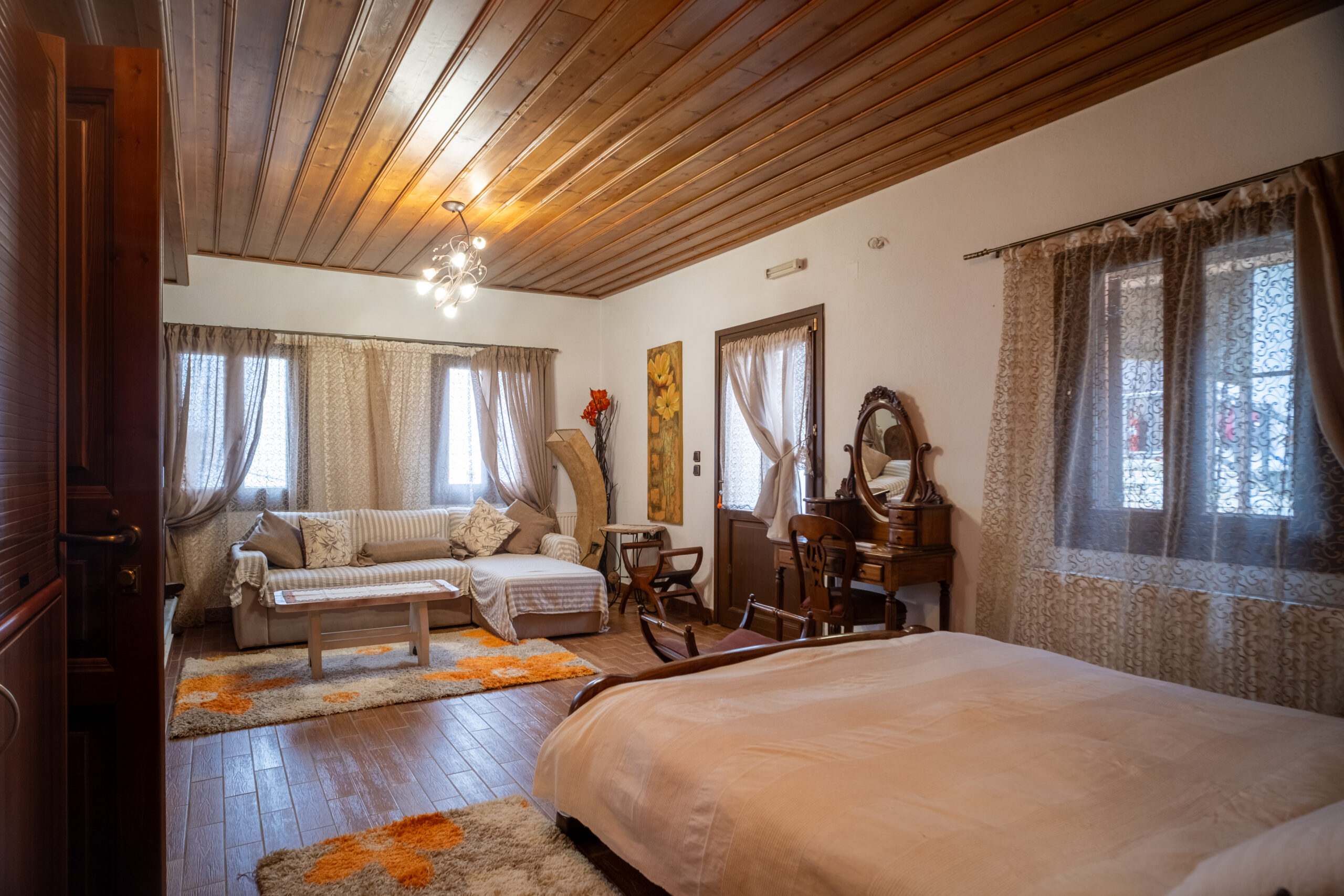Εκτός από το άνετο queen size διπλό κρεβάτι, διαθέτει καθιστικό με καναπέ, ο οποίος μετατρέπεται εύκολα σε κρεβάτι για δύο επιπλέον άτομα, προσφέροντας άνεση και ευελιξία για οικογένειες ή μικρές παρέες.